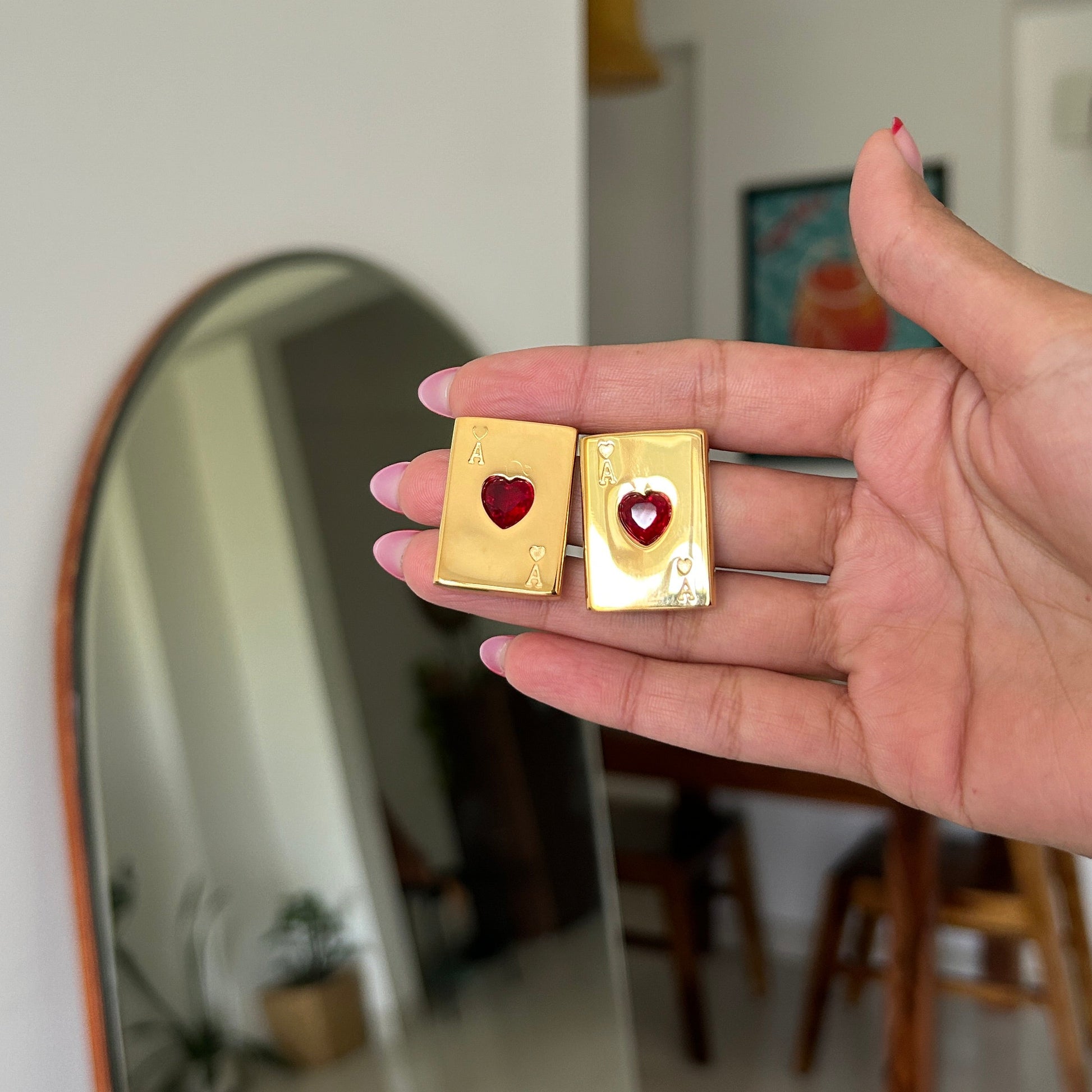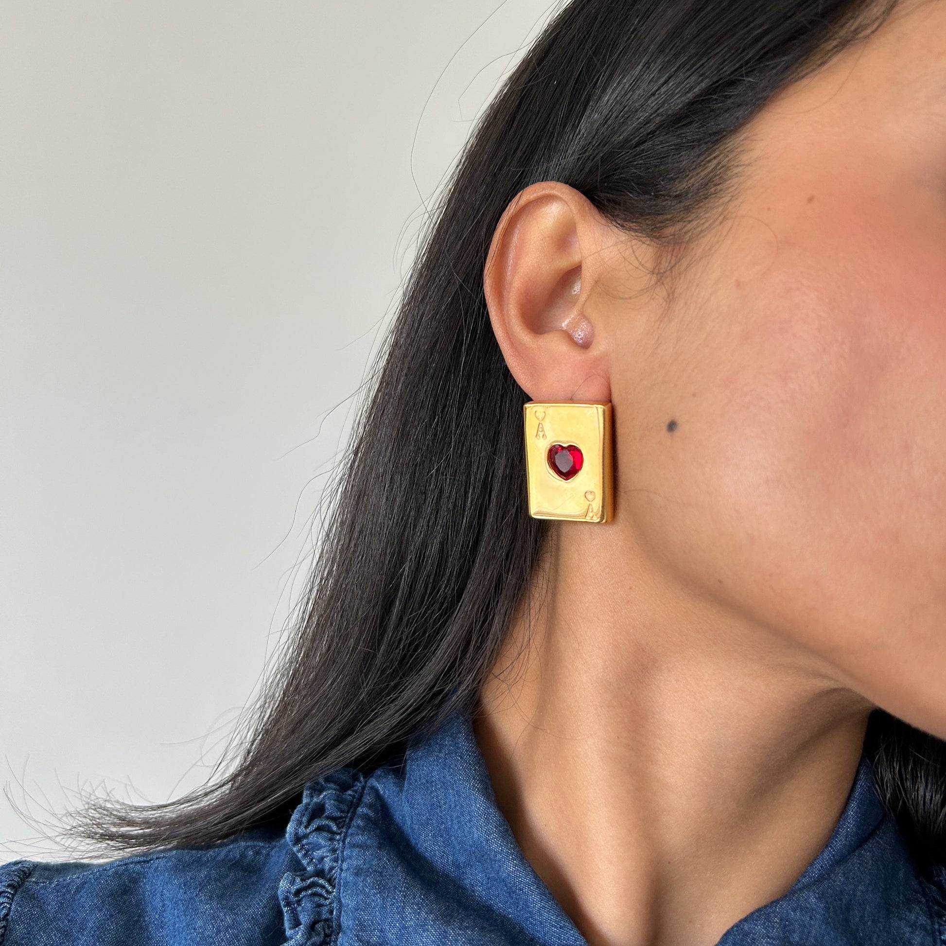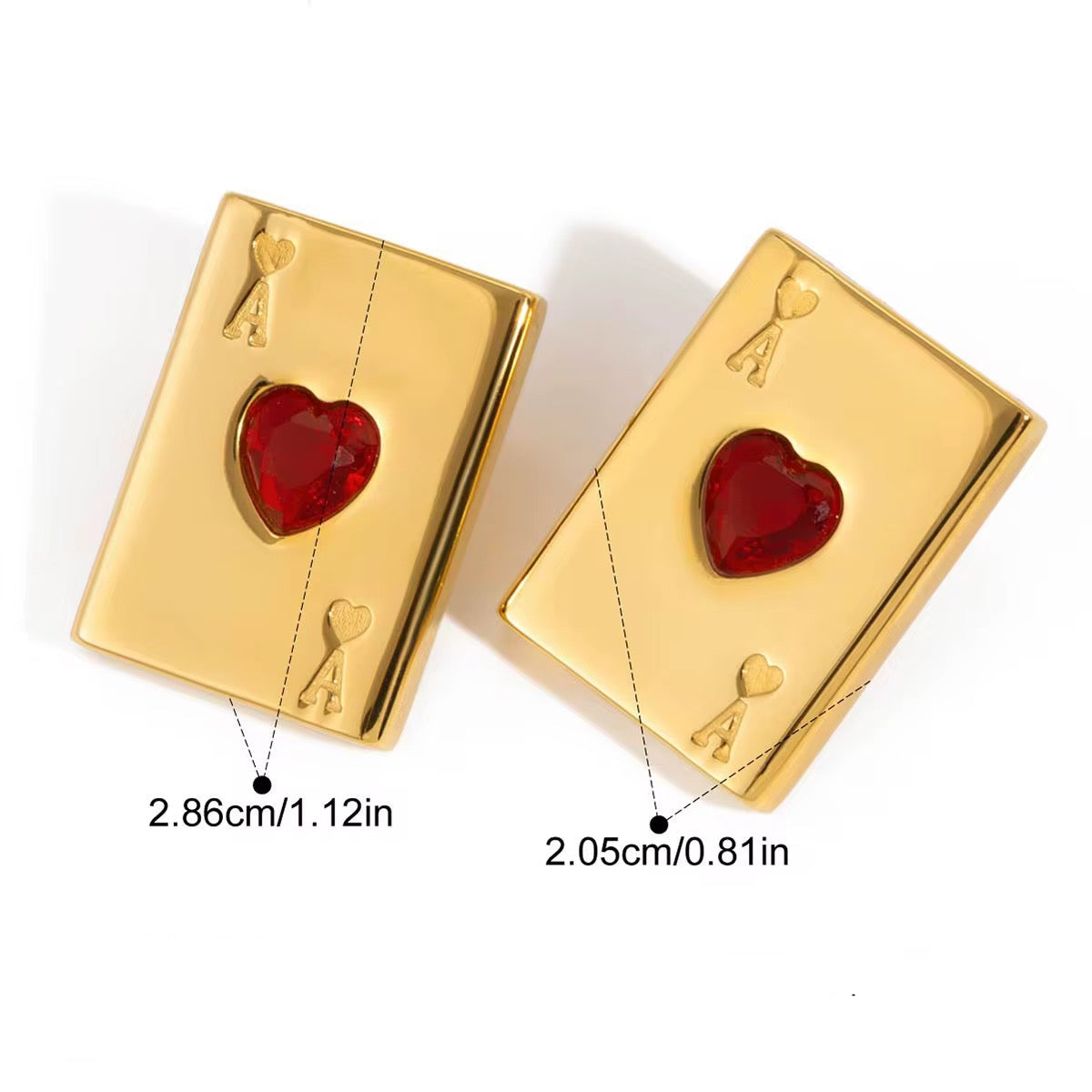 Bold and striking — these card-inspired studs feature an Ace-style shine with a vivid red heart stone at the center. A playful statement piece that adds instant character and charm to any look.