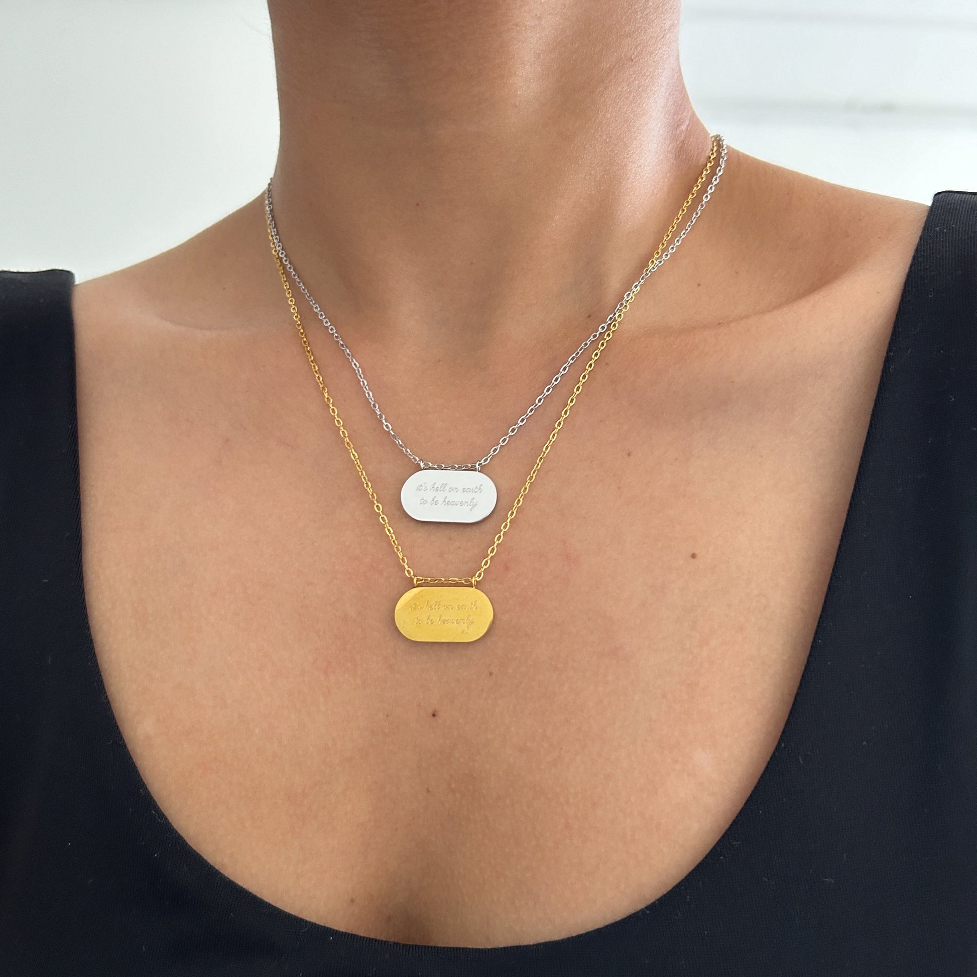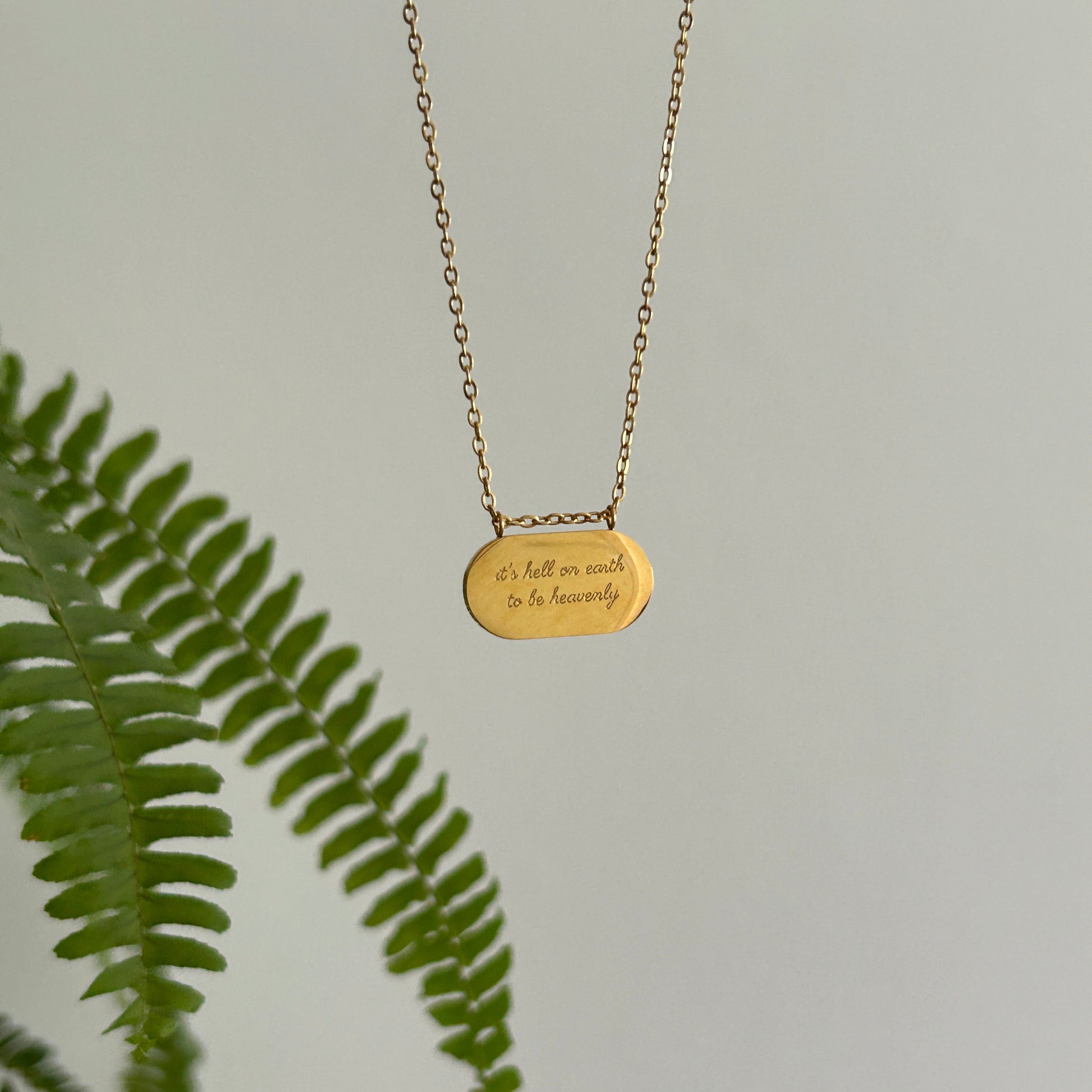 Inspired by Taylor Swift's iconic song "Clara Bow," this necklace stands as a symbol of resilience and strength for every woman who has felt undervalued. Crafted from 18k gold plated stainless steel, the necklace features the poignant lyrics "It's hell on earth to be heavenly." These words resonate with the constant struggle of maintaining a façade while fighting for authenticity.