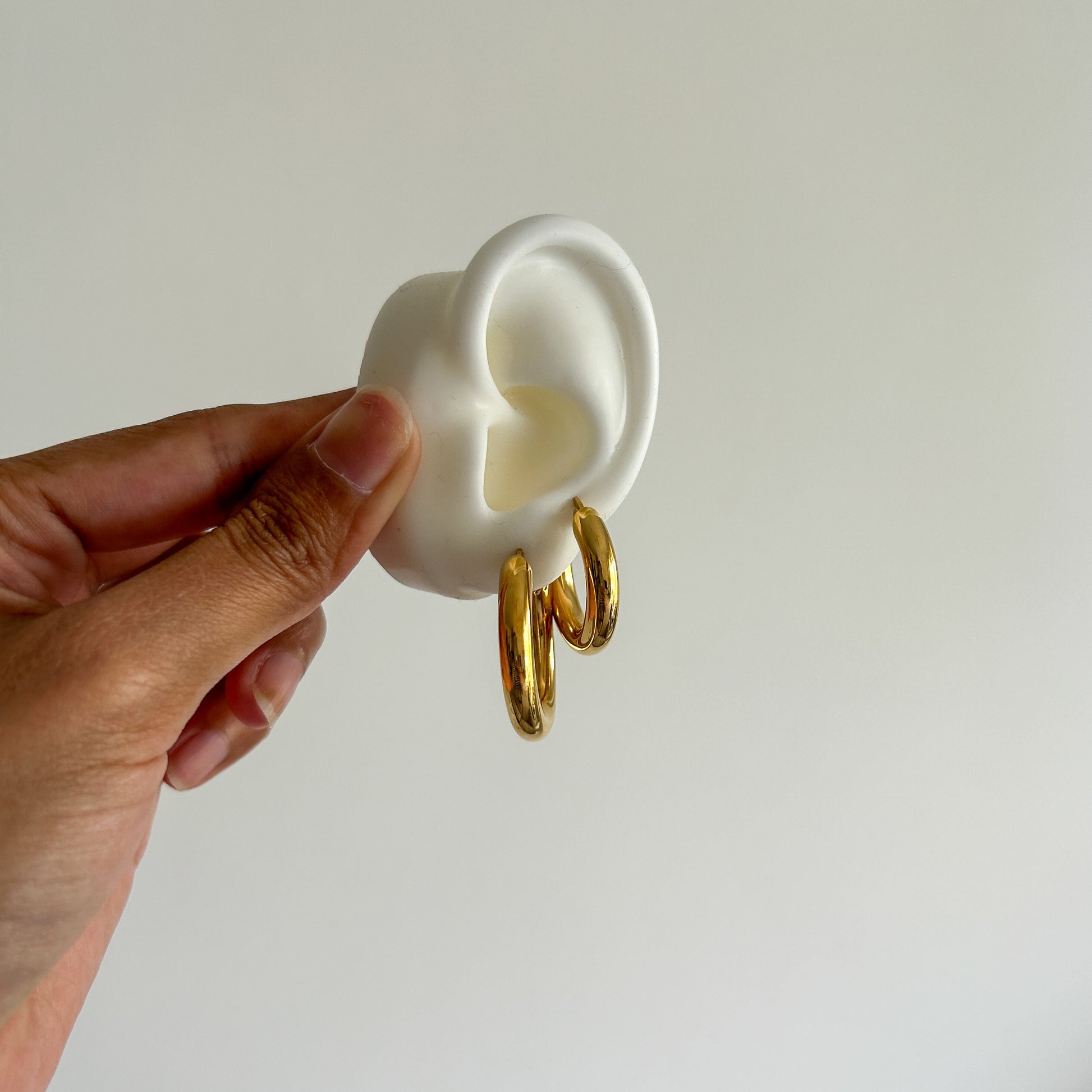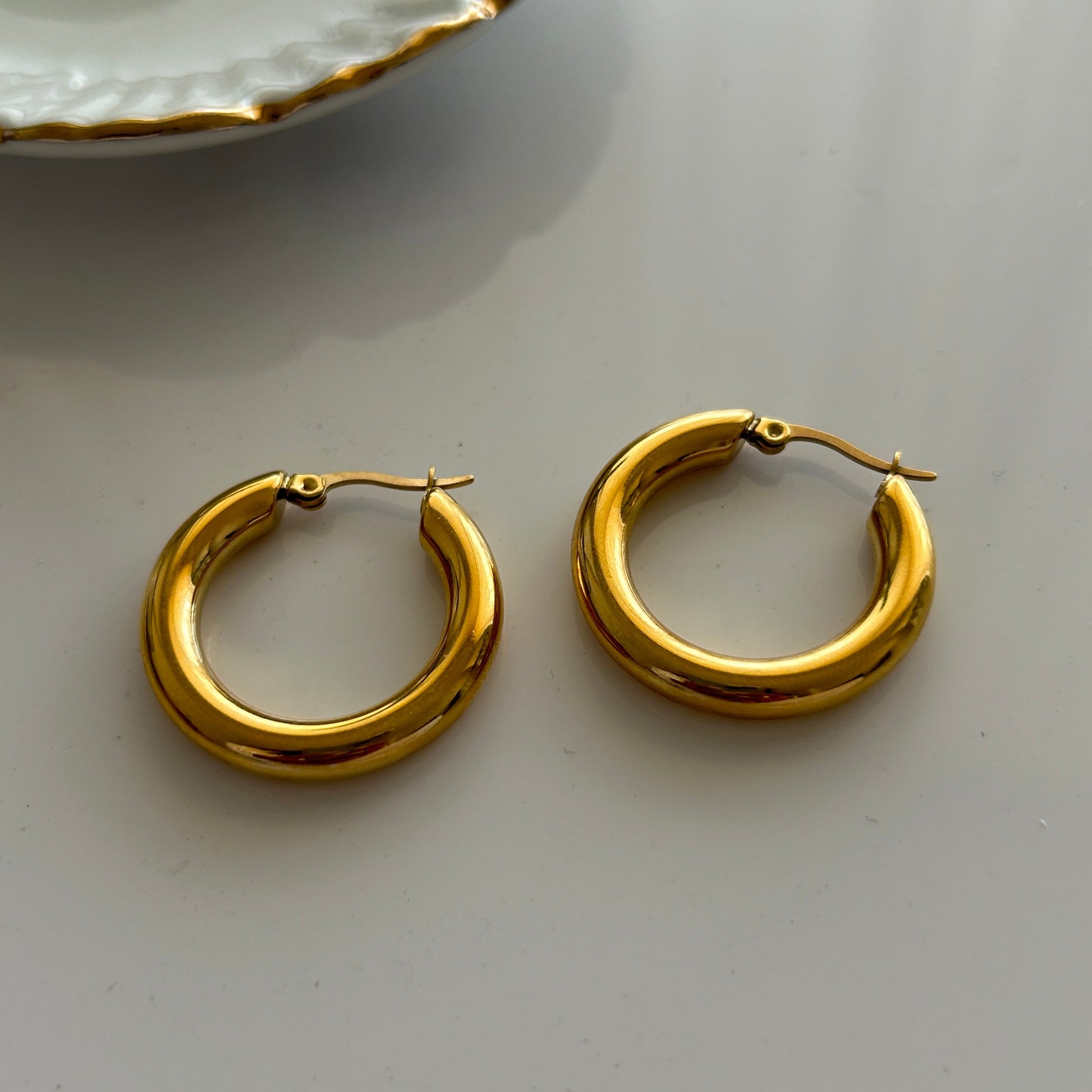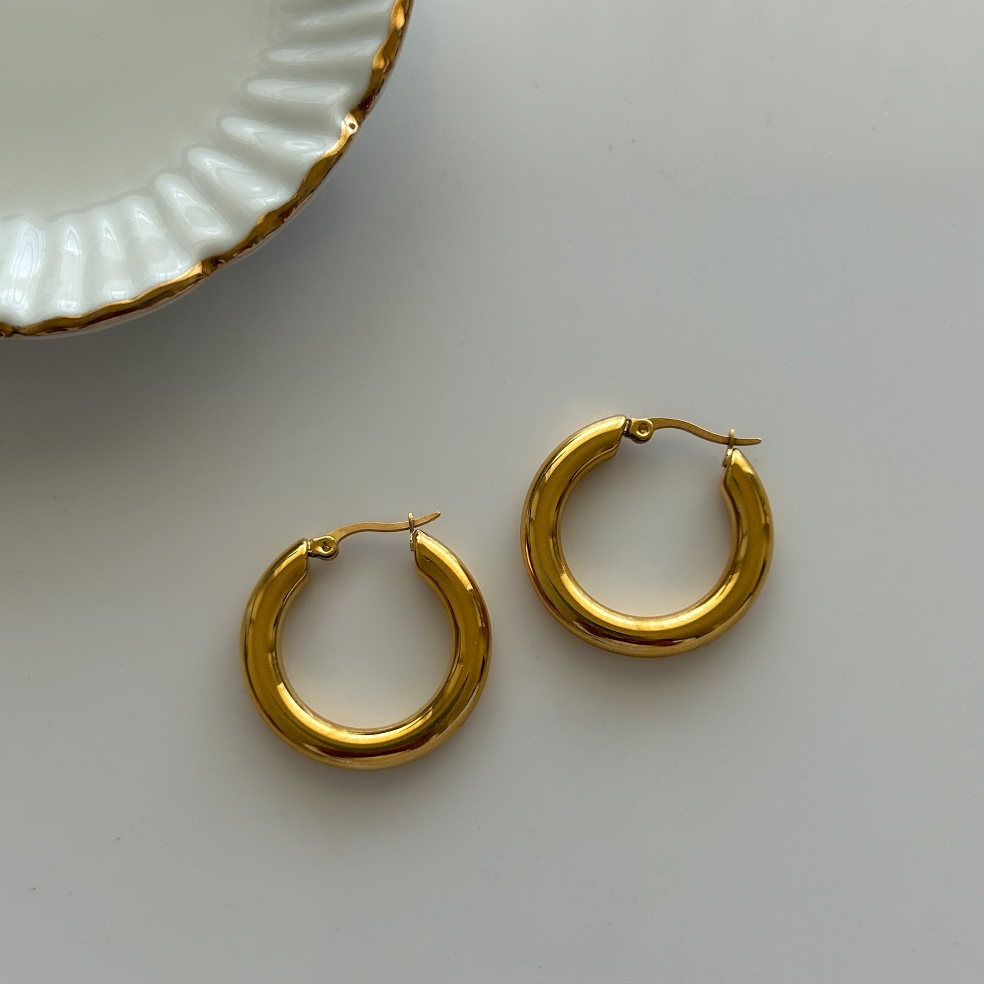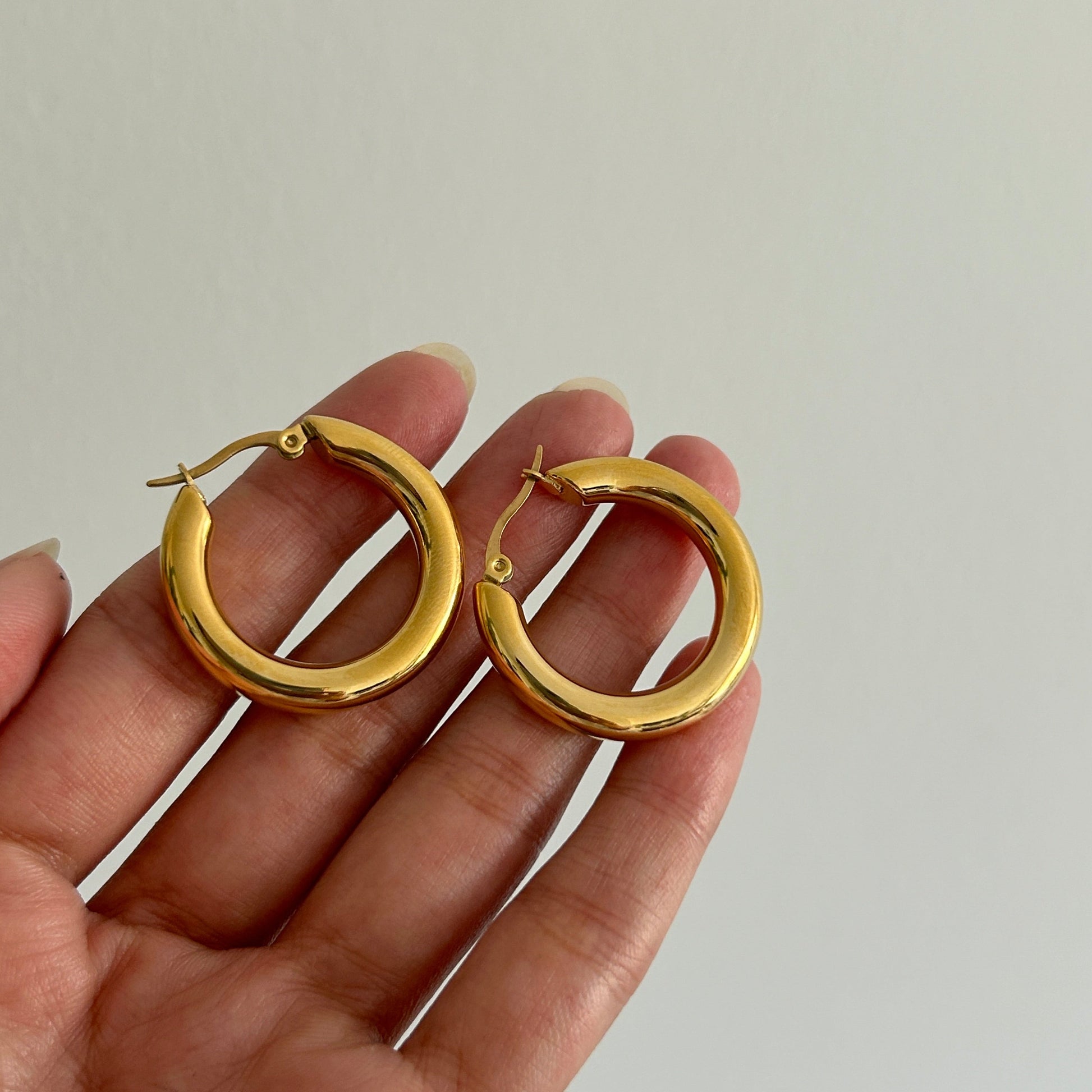 Crafted from durable stainless steel and plated in 18k gold, these timeless beauties are your everyday go-to. Whether you're dressing up or keeping it casual, these versatile hoops elevate any outfit with effortless style.