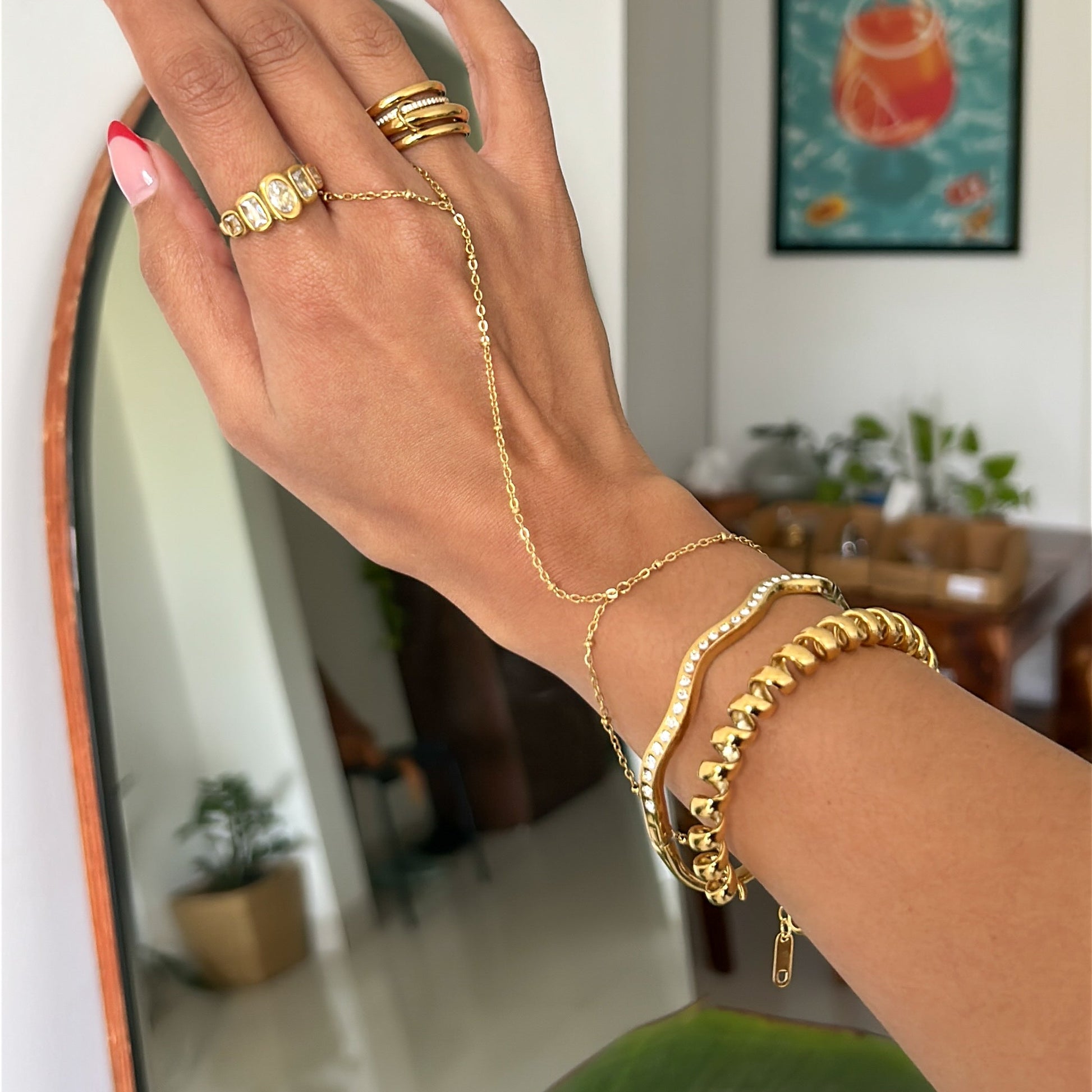 Subtle sparkle, timeless style—Dawn features five radiant stones in sleek bezel settings, offering a modern twist on classic elegance. Perfect for stacking or wearing solo, this ring adds effortless shine to your everyday look. A must-have that’s equal parts chic and versatile.