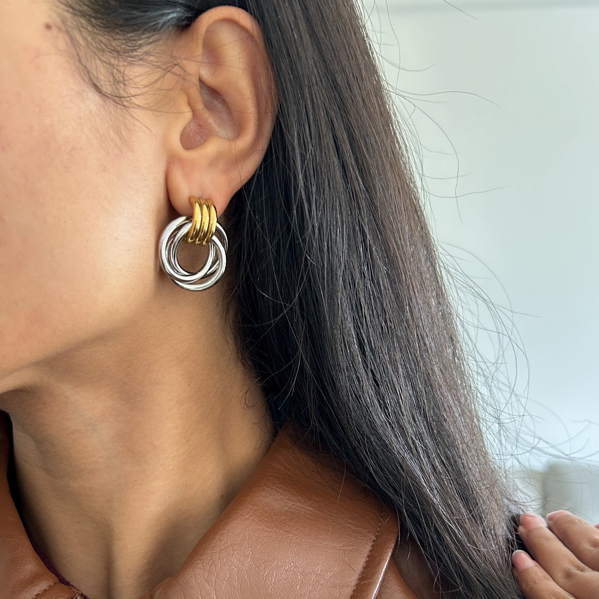 Modern, minimal, and endlessly versatile — these twisted dual-tone studs blend gold and silver in a sleek, sculptural form. Perfect for mixing metals effortlessly, they add a polished edge to both casual and statement looks.