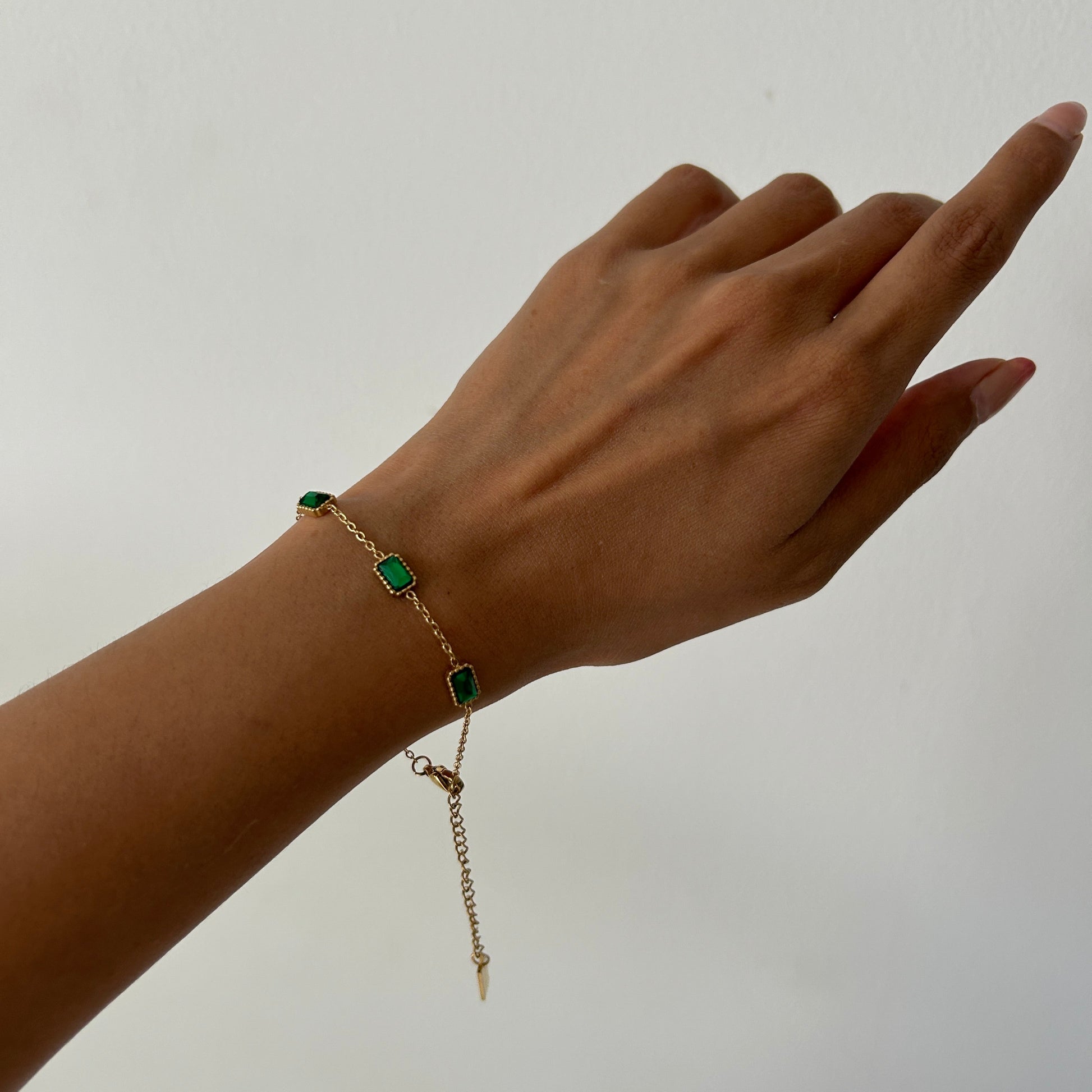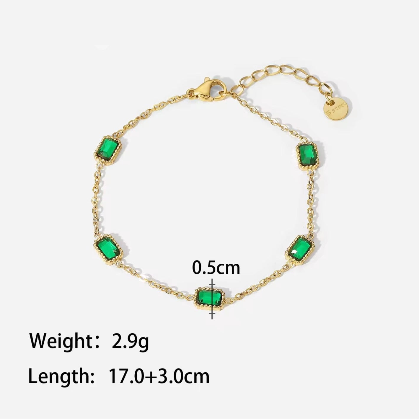 Elevate your wrist game with the Emerald Chain Bracelet β a striking fusion of classic sparkle and modern minimalism. This piece features a series of vibrant, emerald-green cubic zirconia stones, each cut into sleek rectangles and set in refined bezels.Whether worn solo or layered, it's a timeless statement of sophistication and charm.