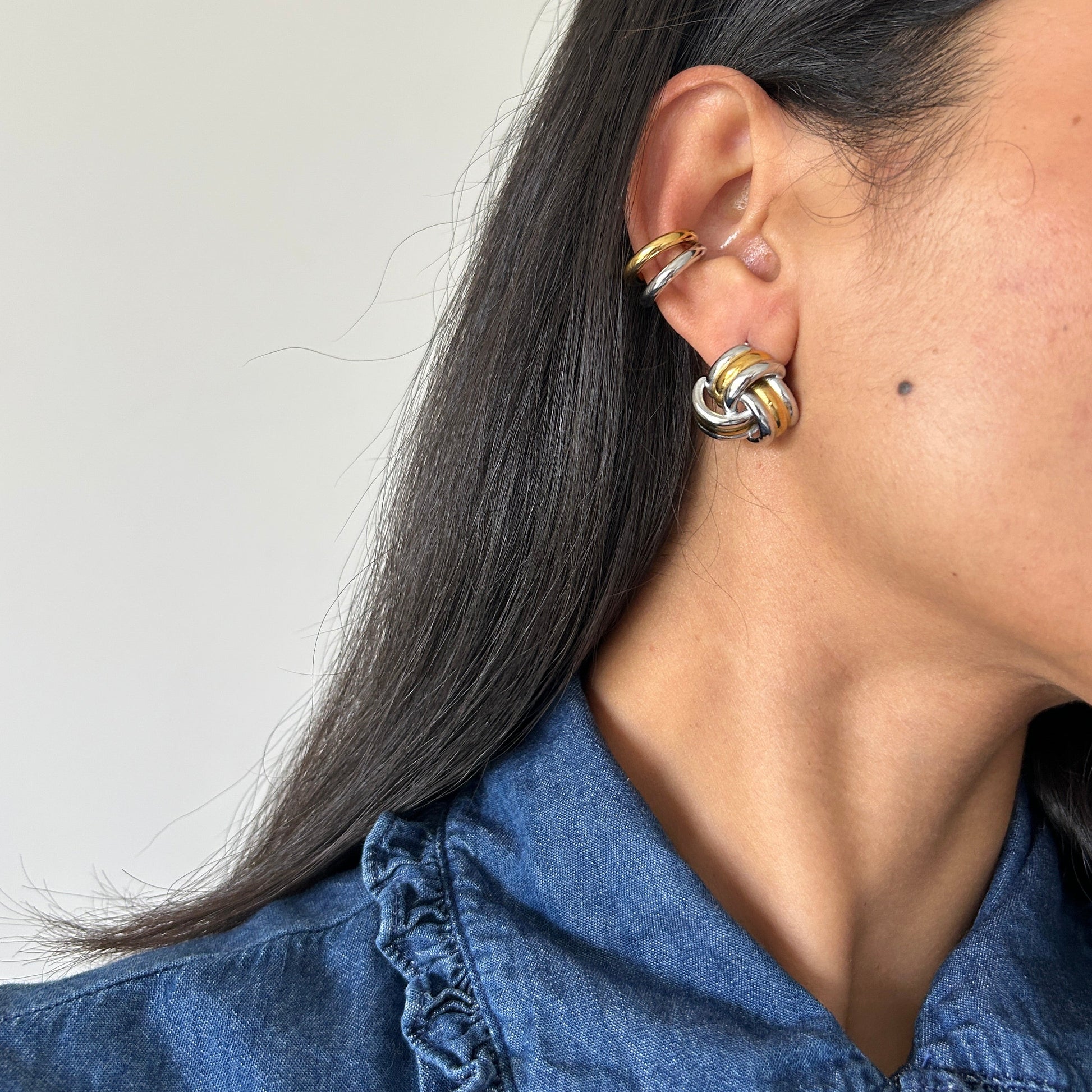 Delicate yet striking — these studs feature three intertwined mixed-metal loops forming a modern, flower-like silhouette. Soft, sculptural, and effortlessly chic, they add a refined touch to any ear stack.