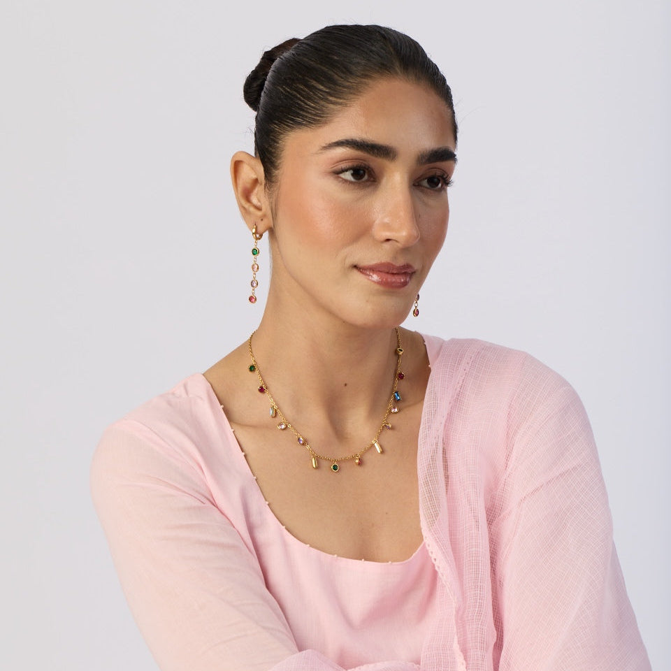 This beautiful multi-stone necklace is the perfect statement accessory. The dazzling array of multi-coloured stones makes this necklace a true head-turner and a stunning addition to any wardrobe.