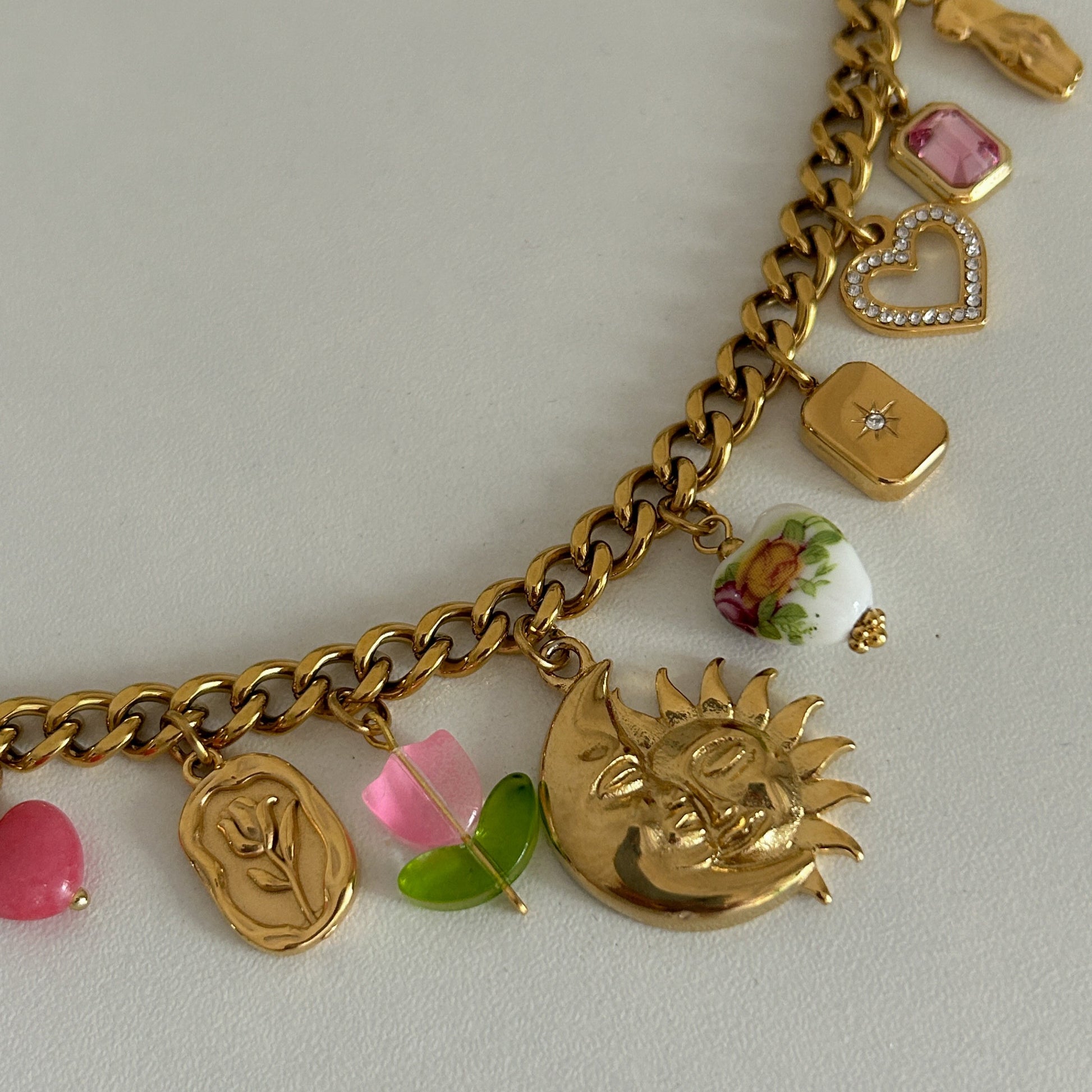 Preorder this style before it sells out again. Elevate your style with our one-of-a-kind Pink Charm necklace. Its 13 unique charms, set on a sturdy 18k gold-plated chain, create a captivating piece that demands attention.