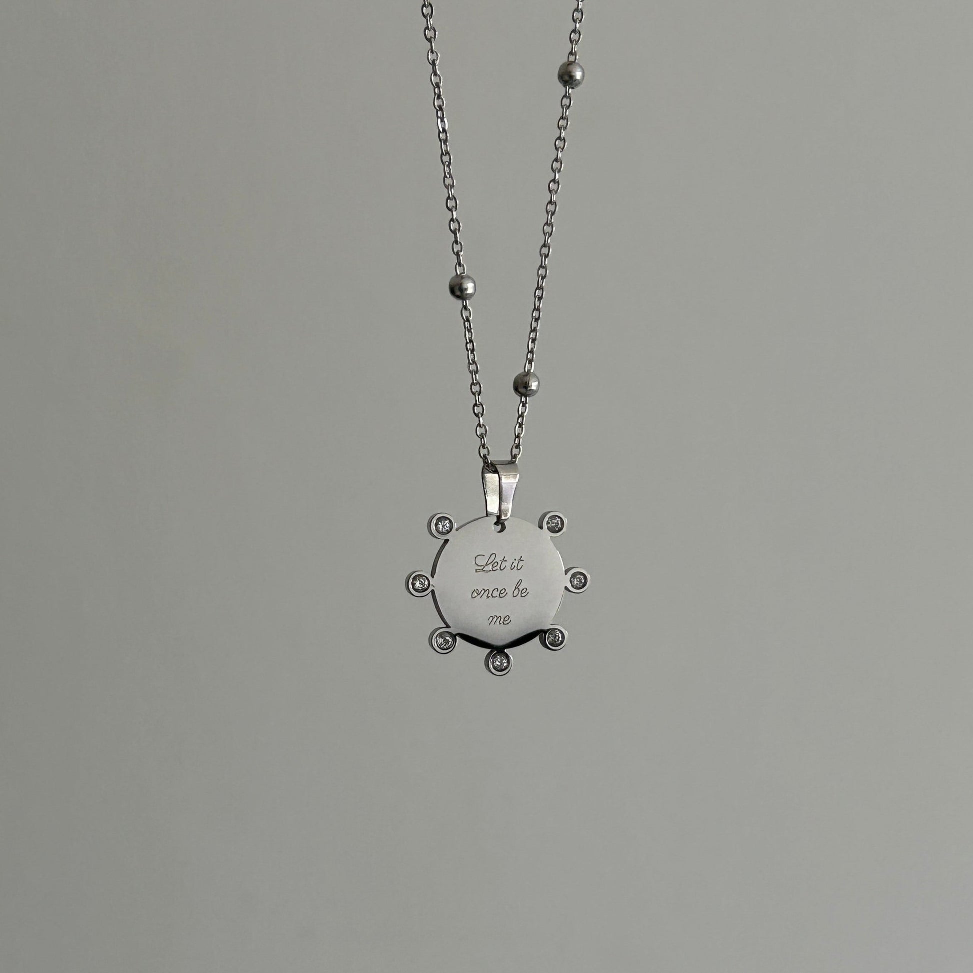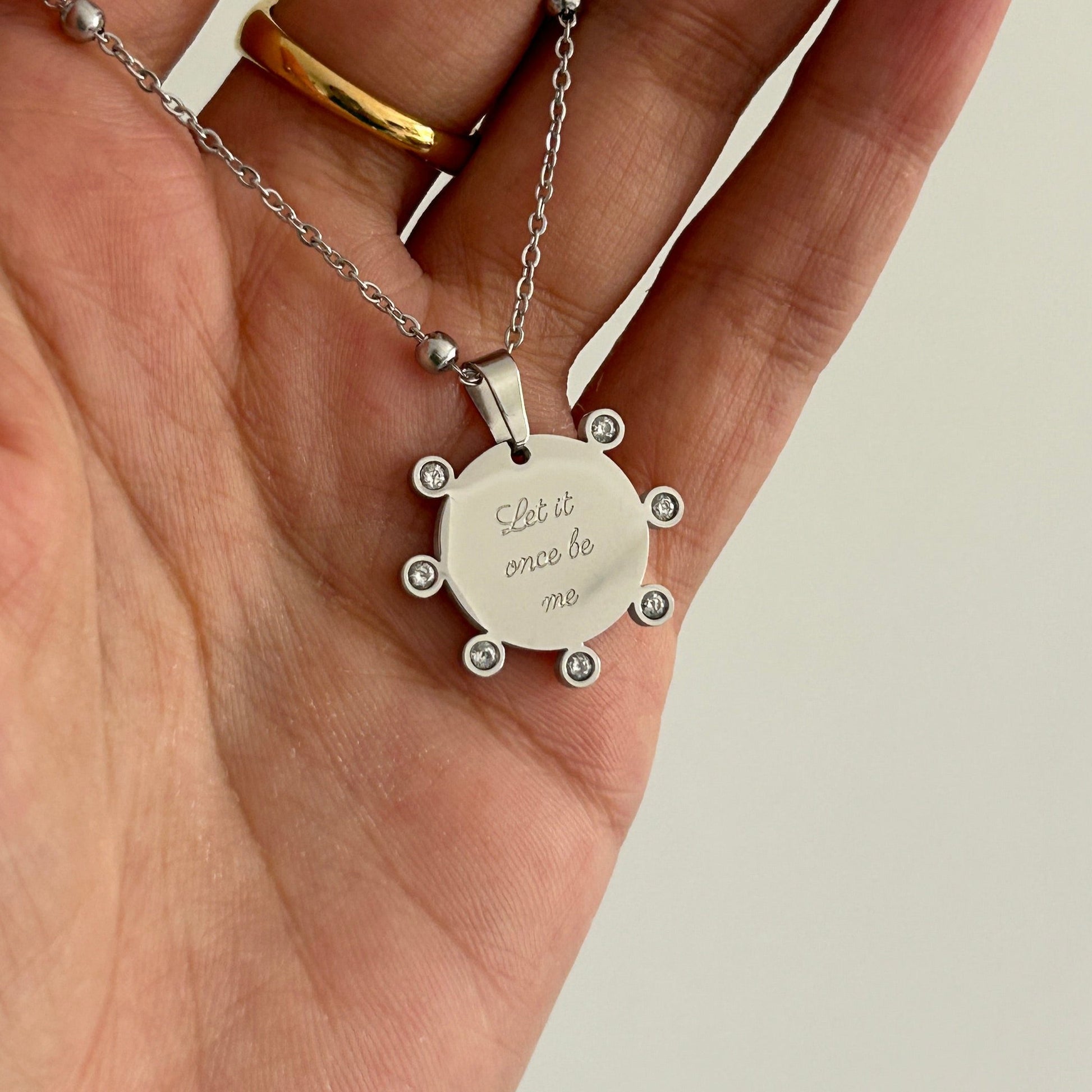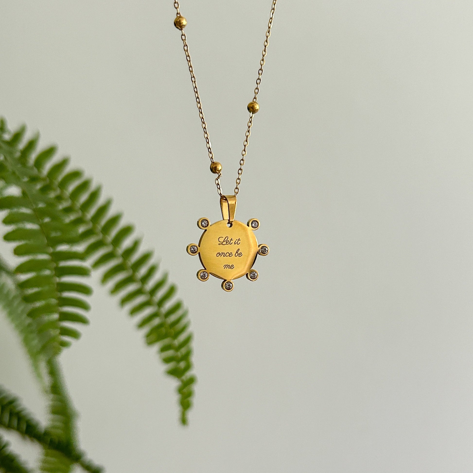 Embrace the magic of our "Let It Once Be Me" Prophecy Necklace. This exquisite piece is crafted from 18k gold plated stainless steel, ensuring both style and durability. The necklace features the poignant lyrics engraved on a round pendant with zircon stones, capturing the essence of a timeless love song. Let this piece be a constant reminder of your dreams, hopes, and the power of words to evoke emotions.