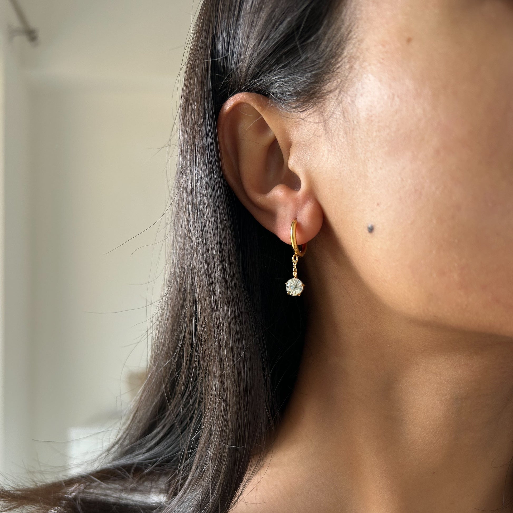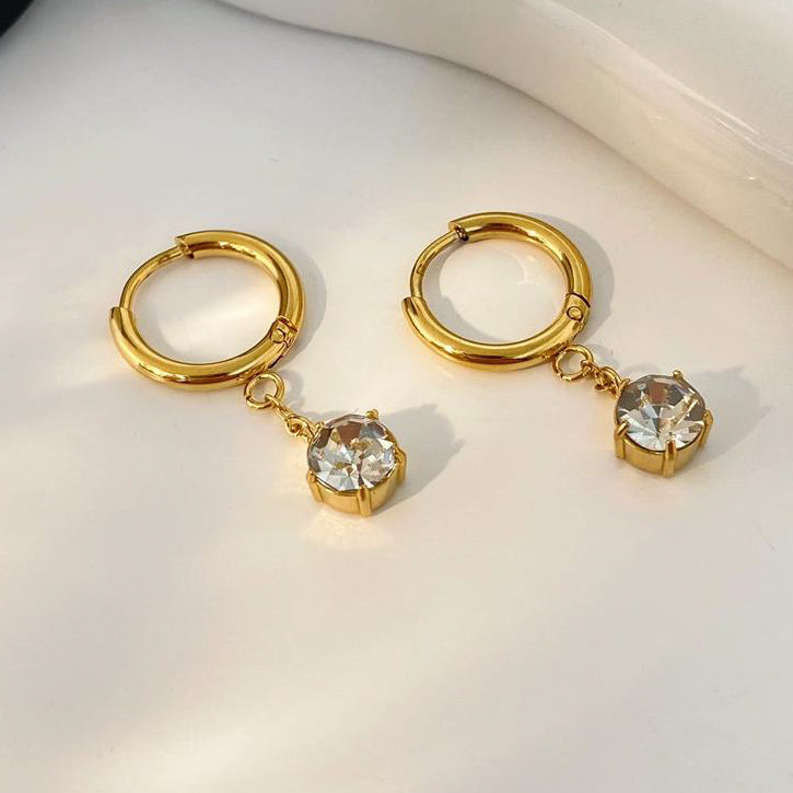 Upgrade your everyday style with our Single Stone Huggie earrings. These minimalist huggies feature a stunning zircon stone suspended from a delicate chained design. Made from high-quality 18k gold plated stainless steel, they are perfect for stacking with multiple piercings. Elevate your look with these versatile and stylish huggies.