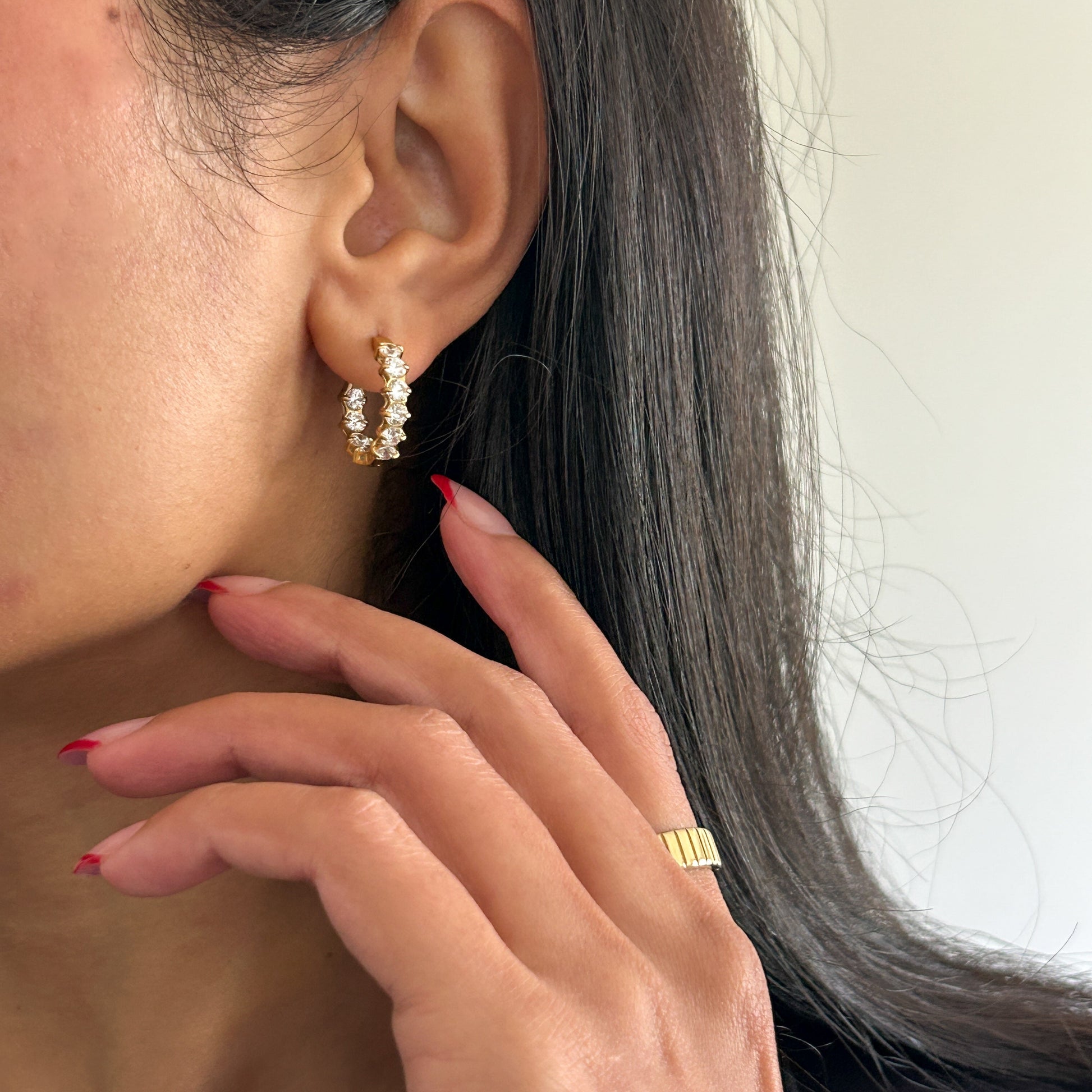 Meet your new favorite hoops — crafted with strengthened settings to ensure every stone stays perfectly in place. These beauties feature sparkling zircons on both the outer and inner rings, creating a stunning dual-shine effect from every angle. Elegant, durable, and endlessly beautiful.